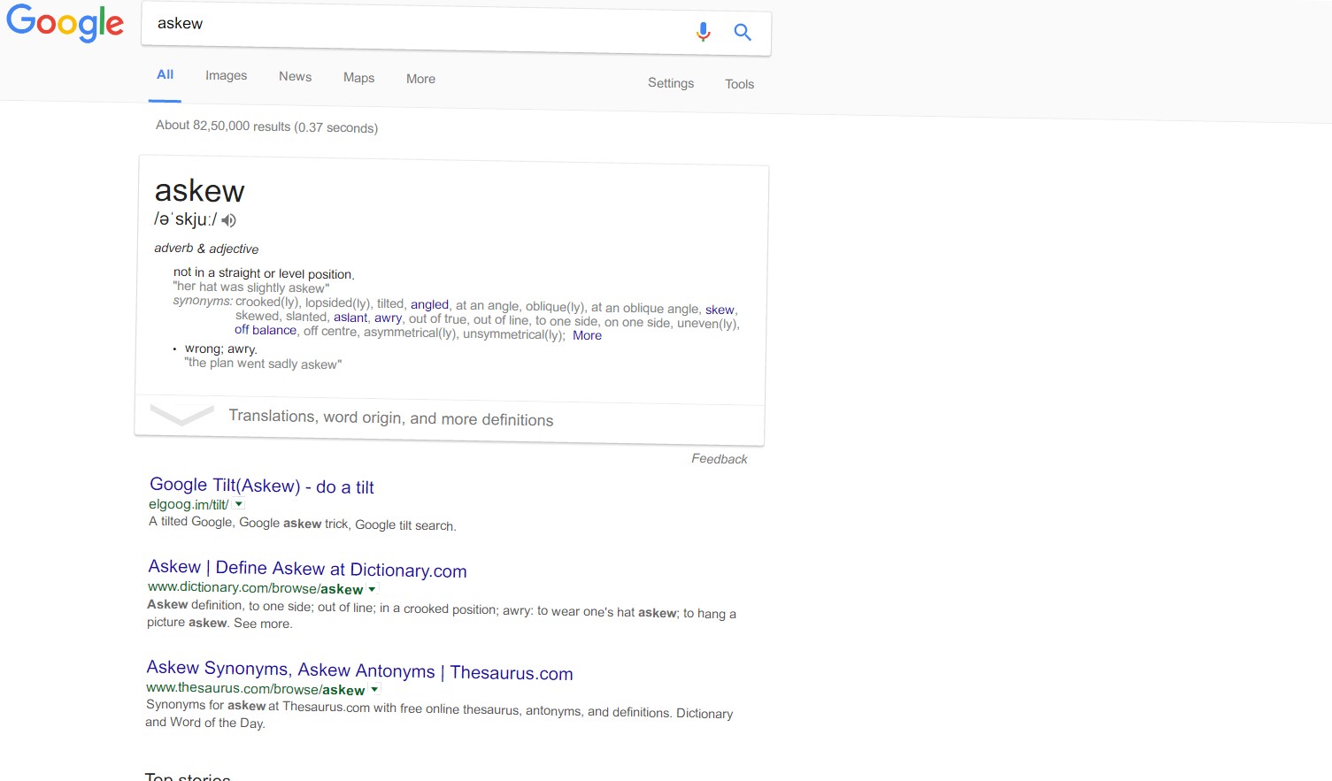 2 – अगर आप Google में “Askew” लिखकर सर्च करे तो Search Result आपको दायीं तरह झुका हुआ नजर आएगा।